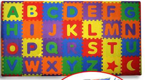 STATS:  28 Interlocking Squares and 28 Push Out Letters.  7×4 foot area coverage.  Soft foam mat.