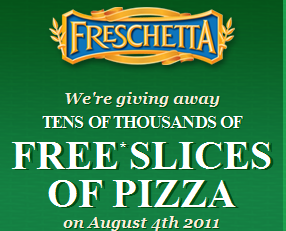Free Freschetta pizza Check back on August 4th starting at 12PM EST to get free Freschetta Pizza by the Slice voucher. Sign up for a reminder email to be sent on the day of the giveaway.