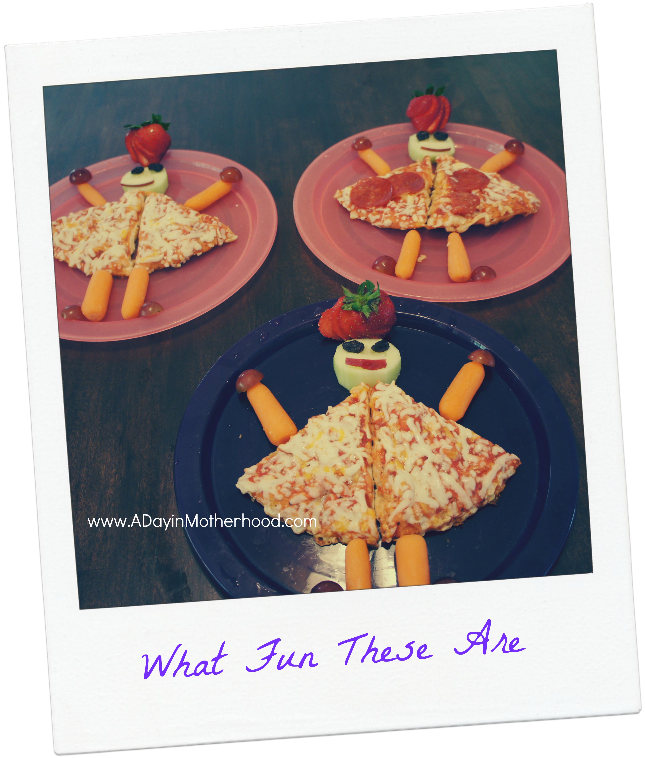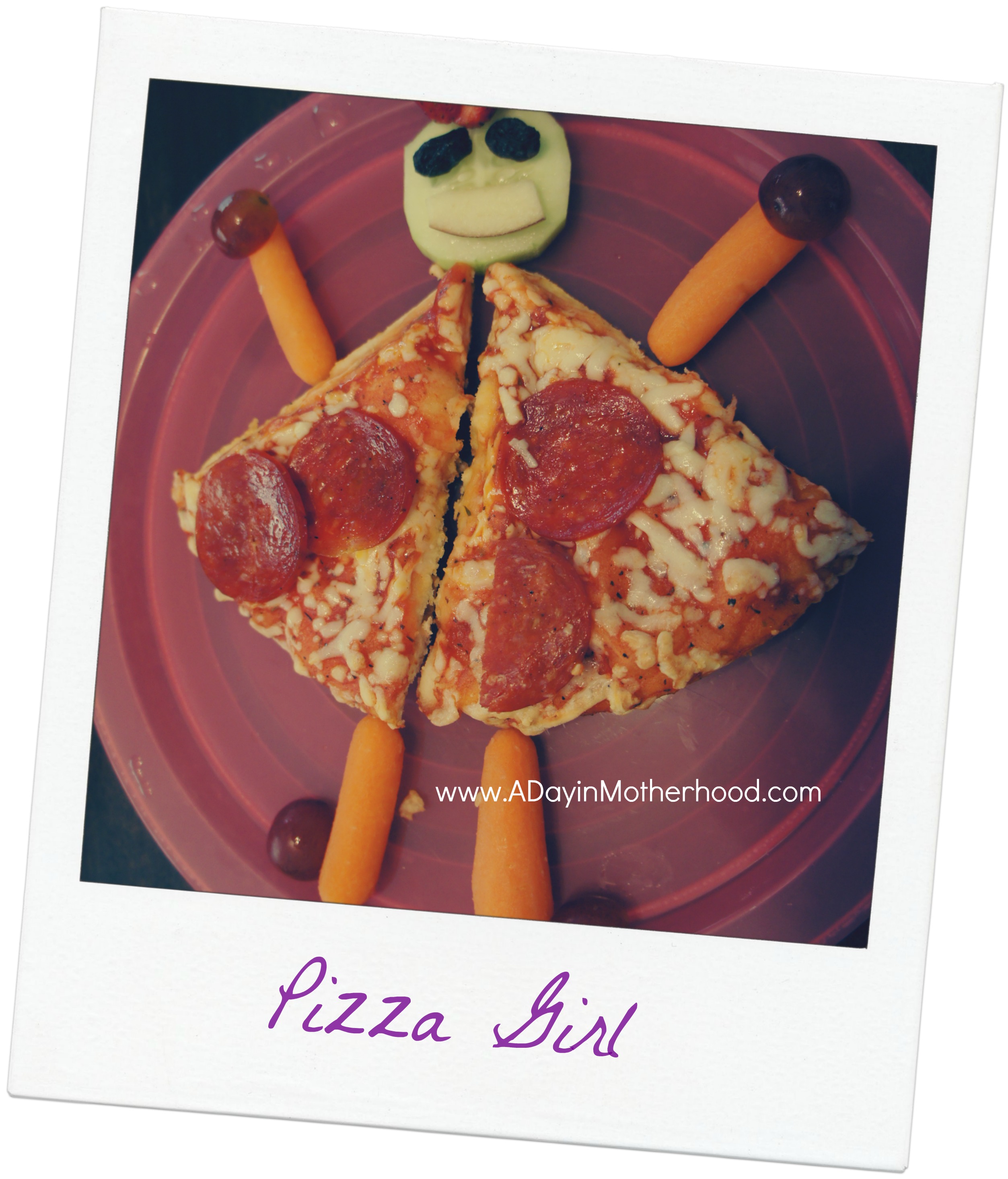 I used two sliced of pizza for the dress,  baby carrots for her arms and legs with grape halves as her hands and feet.  I fanned a strawberry as her hair/ hat and used raisins as her eyes and a small red apple slice as her mouth!