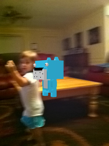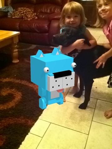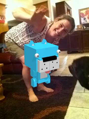 So the reason you have to have all of this fancy technology for this app is because the Cube Dog is 3D and able to spin, flip, and turn all 360 degrees in all positions. The girls laughed and laughed as they spun him round and round while he made the cutest little noises to add to their glee! They zoomed him in and out in our living room and even had him chase our real life dogs around!