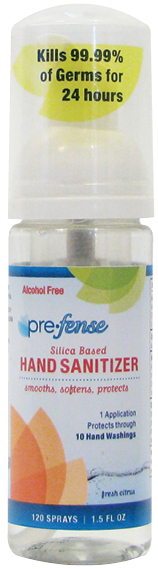 * Prefense is silica based which means it doesn’t dry out your hands like traditional alcohol sanitizers. It actually smooths and softens your hands.