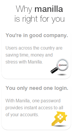 Manilla (manilla.com) is a free web based service that helps consumers better manage all of their household accounts, including financial, utilities, subscriptions and travel rewards programs, in one secure place online. Under a single password, Manilla provides customers with an automated, organized view of all of their account information, text and/or email reminders to pay bills and unlimited storage of account documents that Manilla has seamlessly retrieved for the consumer.