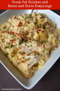 It is cold and miserable outside. Even in Texas we have ice on the roofs, hanging from the trashcan and burdening our trees. I am actually watching one branch that, should it fall, my electricity will be cut and I will be relying on candles and patience to get through it. Luckily it has held on so I have been able to make one of my favorite comfort foods ever! Chicken and Dumplings. But, as you know, I like to add twists to my recipes to make them a little more fun. So I added bacon and chives to the dumplings and got the amazing and delicious Slow Cooker Chicken and Bacon and Chive Dumplings!