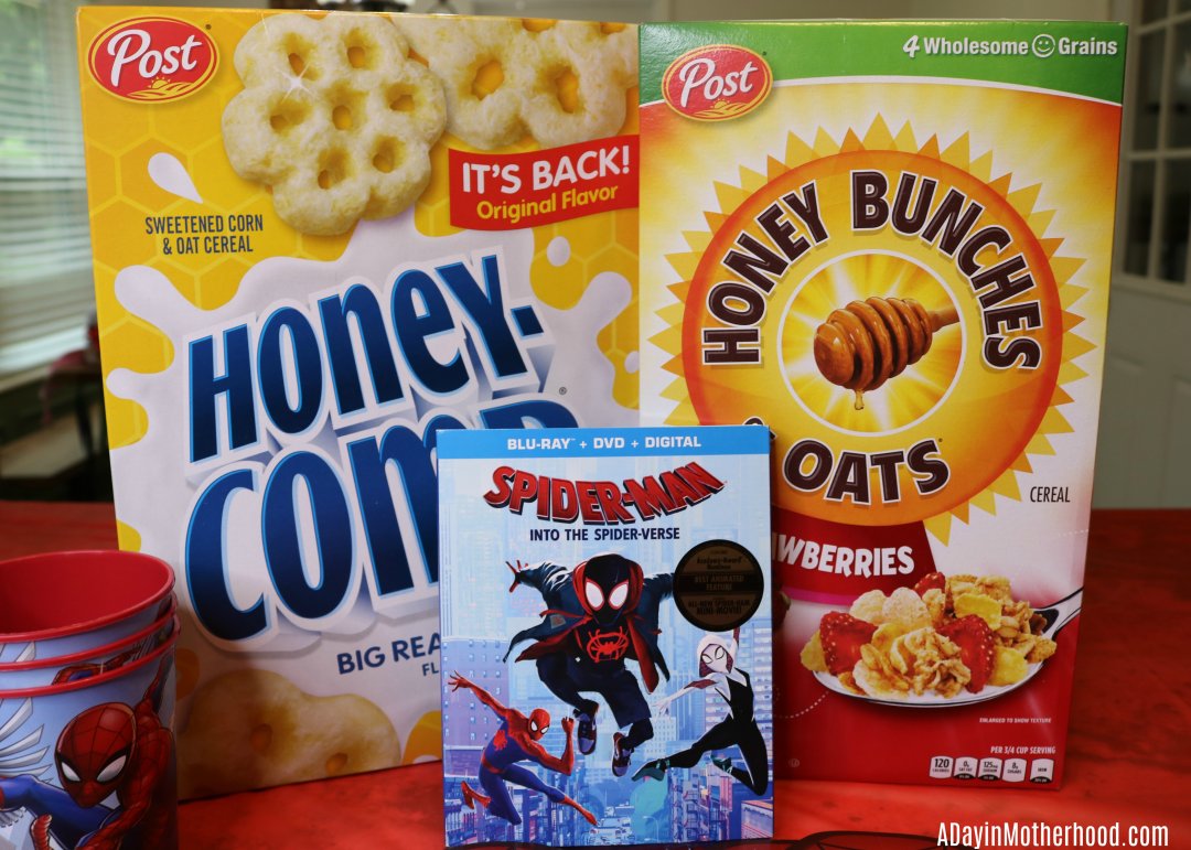 That is why I chose Spider-Man into the Spider-Verse as our movie, actually. It introduces Brooklyn teen Miles Morales, and the limitless possibilities of the Spider-Verse, where more than one can wear the mask. The girls and I missed it in theaters due to extra-curricular activities and were pretty bummed about it. Surprising them tonight with this, some Honey Bunches of Oats® Strawberry Marshmallow Treats and chocolate splashed Honeycomb® cereal will just make the whole night a little more colorful!!